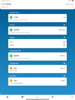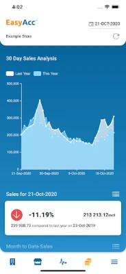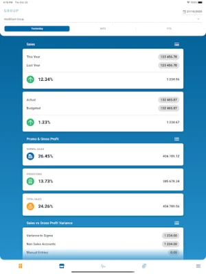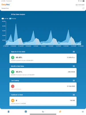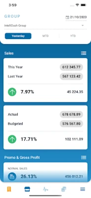 - User Login - Push notification - Sales (and comparing with the same day of week last year) - Month to Date sale (and comparing it to last year) - Last Cashup date - Last 31 days graph - Cashbook vs Bank - Credit Card Control - Drop Cash