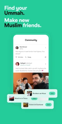 On Jamaa, you can be your unapologetic Muslim self. Connect with Muslims nearby, in your local Muslim community, or around the world, and make friends with those who share your faith. Join private groups for anything that matters to you, from local sisters groups and revert support circles to Quran study, uni Islamic societies, divorce support, for halal investing, or planning trips like Umrah or Hajj. Ask for advice, share knowledge, discover Muslim events, make friends, or simply connect with Muslims who share your faith and values.