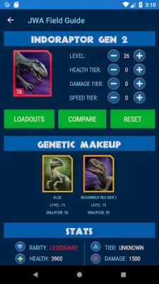 JWA Field Guide also contains an extremely useful Evolve Costs calculator which quickly tells you how many coins and DNA resources are required to evolve a dinosaur of a particular rarity type from one level to any other level. The calculator can also tell you what level you can evolve your creature to by specifying how much DNA you have on-hand.