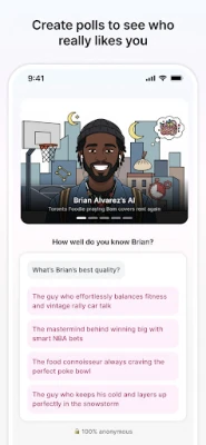 Your AI creates the questions and answer choices. Your friends respond anonymously. You find out who likes you, what people actually think of you, and where you stand - without ever asking directly.