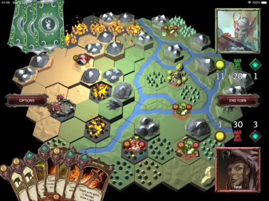 Hone your turn-based strategy skills. Matches in Kingdom Draw take place on a hexagonal grid where you play army, support, and beast cards on the map. Strategically control locations to earn more resources, take advantage of terrain, and be the first to destroy your opponent’s castle. Use power cards to decimate your enemies, alter your cards’ combat effectiveness, and modify the terrain.