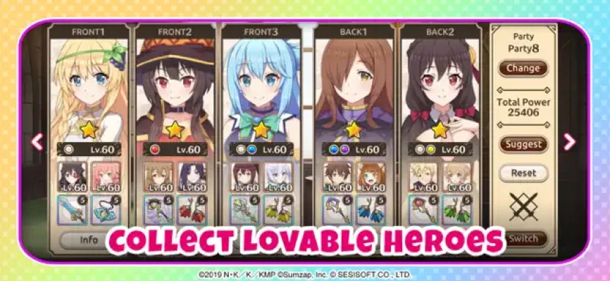 Collect, dress, and forge unbreakable bonds with your favorite KonoSuba characters including, but not limited to: