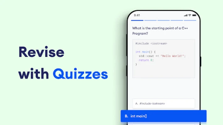 to follow through C++ tutorials, use the built-in C++ compiler to write and run C++ code in each lesson, take quizzes and more. The app covers