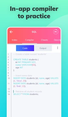 Learn SQL is a must have app for all coding learners or computer science students to learn sql programming language whenever they want and wherever they want. Whether you’re preparing for an sql interview or any exam that requires sql programming knowledge, you can find amazing content on this programming learning app.