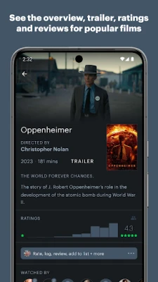 – Browse popular, highly rated and most anticipated films, including trailers, member ratings, artwork, cast + crew details, studios, genres and popular reviews