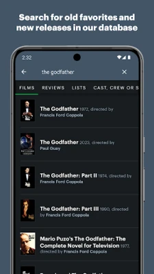 – Search for films, cast + crew, reviews, lists and members