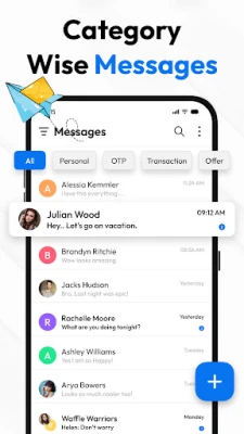 Messages Text SMS App makes staying in touch simple, fast, and secure. Designed for everyday use, it helps you organize your inbox, block spam texts, copy OTP codes instantly, schedule messages, and reply quickly after calls — all in one lightweight and customizable SMS app.