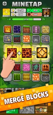 Start the saga. Pick up a pickaxe, Tap to dig, mine resources, merge blocks, and craft gear at the workbench and forge. Build a Miner hero, fight monsters, and grow from miner to Tycoon of treasure. No mod required.