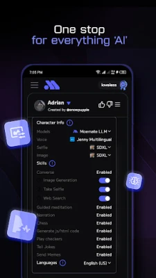 Use advanced creation tools to create anything you need. Immerse yourself in captivating anime stories, get homework help from your favorite celebrity, learn a new language, and even write a novel… all with the help of the most advanced AI companion that YOU design! The only limit is your imagination and we encourage you to push the frontier of what’s possible with this new technology. With Moemate you get multiple language models, voice cloning, custom image models and so much more - all for one low, low price.