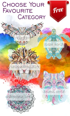"MY coloring book" is FREE and contains a variety of coloring books in different categories such as savanna wildlife, ocean life, fly with a wind, animal world and also so popular mandalas for harmony.