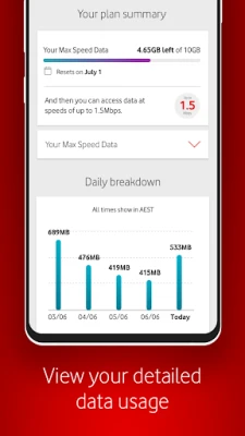 The features of the app are subject to change. The app is free but download charges apply for downloading from the Google Play Store. Non Vodafone customers can download the app however data charges will apply as per your plan rate. When accessing the app overseas, international roaming charges will apply. When on Wi-Fi, My Vodafone may not continuously update if you’ve logged out of the app.