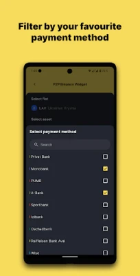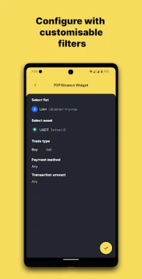 A configurable widget that shows you the list of the latest P2P advertisements from the Binance platform. You can add multiple configurations of the widget to your home screen. The widget allows you to filter advertisements by fiat, asset, trade type, transaction amount, and payment methods.