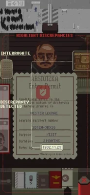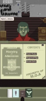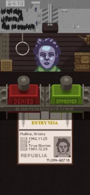 Using only the documents provided by travelers and the Ministry of Admission's primitive inspect, search, and fingerprint systems you must decide who can enter Arstotzka and who will be turned away or arrested.