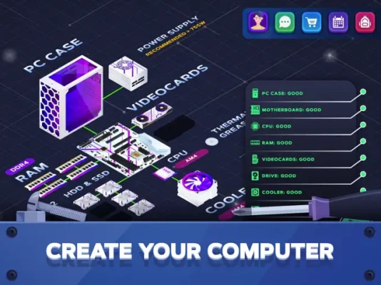 Based on the fact that PC Creator Game was developed as realistic as possible, so that is a great opportunity to learn how to shake out the bugs, improve your PC. You will also learn how to choose new, more powerful, and compatible computer parts. Moreover, our game will teach you to fix your PC, clear it from viruses, become a bitcoin miner and lots more.