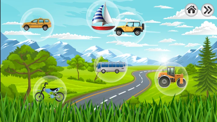 On the “Car Sounds” screen, the kid learns what sounds are emitted by different types of transport: buses and trucks, motorcycles and scooters, excavators and loaders, ships and aircraft.