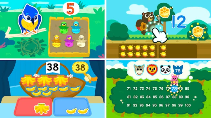 Pinkfong's animal friends will introduce and guide your baby through different kids number games, such as collecting beehives, tracing numbers on the leaves, and counting numbers of the snails.