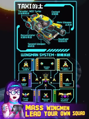 * Innovative wingman system. You can pick up eight wingmen from your vast Arsenal and fight for you at the same time. These wingmen have expertise in attack, defense, replenishment, ability bonuses, etc. The best team can be selected according to the combat objective.
