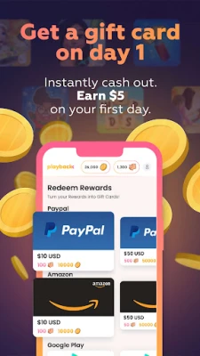 Earn coins and piggy banks by downloading, playing, and purchasing in new games. Redeem those rewards for gift cards to your favorite retailers like Google Play, Amazon, and Target.