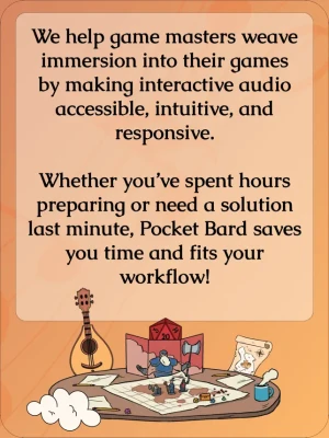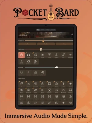 Pocket Bard is a fully immersive audio experience for your tabletop RPG game session. With just a tap, change your entire soundscape to match the tone of your session - from moment to moment, alter the intensity of the music and sound effects to pair perfectly with your gameplay.