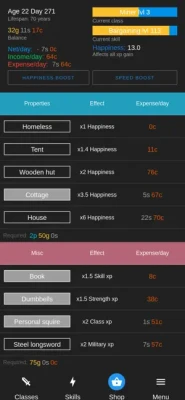 You first start off as a beggar, barely being able to feed yourself as the days go by. However, over the years you learn new skills and gain plenty of work experience to enter new high paying jobs while managing your living expenses...