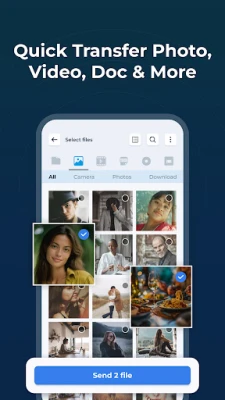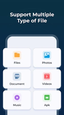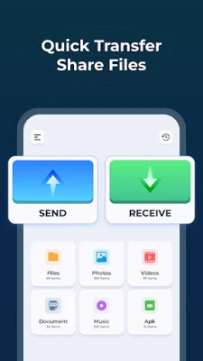 Quick File Selection: Easily pick the files you want to send – all your files are categorized (Photos, Videos, Documents, Music, APK), making it faster to find and share.
