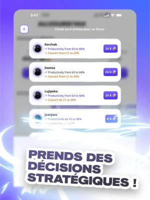 - Artist Development: Improve your artists' skills by participating in Focuses.