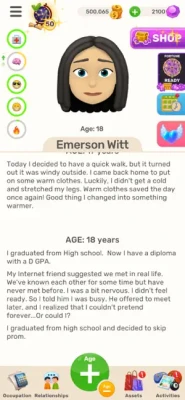 Immerse into the virtual life of this idle sim - make different decisions, adopt any lifestyle, go from poor to rich, aim for a career of success and fame and engage in exciting situations. This is a simulator game and you are the one to decide your fate from the little till the end.
