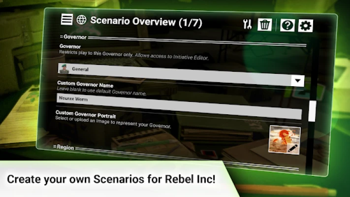 The Rebel Inc: Scenario Creator is a powerful yet easy to use content creation tool which lets players bring their best ideas to life as they develop their own custom scenarios for Rebel Inc. and then share them with the world.
