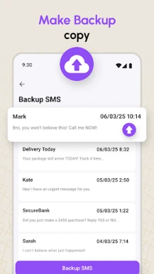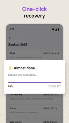 Another powerful feature is to backup your SMS conversations! The Backup and Recover Messages tool will create a small backup file containing all your existing conversations, contacts numbers, and received data and store it in your storage! It's an easy process, click on the backup button, and the SMS Backup and Restore app will auto-backup your SMS messages! After that, you will be able to perform a message recovery with just a few taps.
