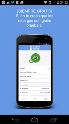 • Esta aplicación de RECARGAS GRATUITAS a Brasil tiene la garantía de https://www.recargadobleacuba.com, http://www.recargasnauta.com, http://www.recargasgratisacuba.com y http://www.smsgratisdesdecuba.com, las mejores apps en RECARGA DOBLE a Cuba, RECARGAS GRATIS a Cuba, RECARGAS Nauta y envío de SMS GRATIS a Cuba. Si no estás convencido, pruébalas y verás lo fácil que es recargar con nosotros, sin costos de procesamiento y sin registrarte: