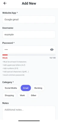 • Category support (Social Media, Email, Banking, Shopping, Work, Other)