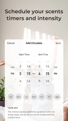 ○Customizable Scent Timetable: Manage your fragrance experience through the app by setting personalized schedules. Decide which scent to release at specific times, automatically turn off the diffuser when you're away, and activate your favorite aroma before you arrive home, ensuring a warm, natural scent welcomes you as soon as you step inside.