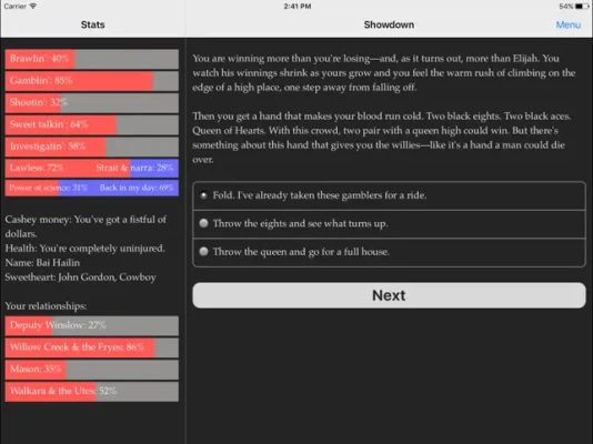 Showdown at Willow Creek is an interactive western mystery novel where your choices control the story. The game is entirely text-based--without graphics or sound effects--but powered by the vast, unstoppable power of your imagination.