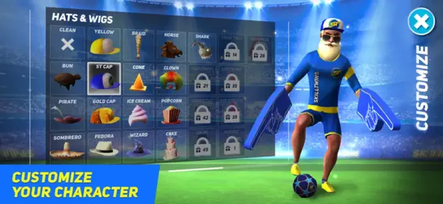 Change hairstyle, clothes, accessories, footballs, opponents & more! Make SkillTwins wear a boat while skilling? Or carry a shark hat? With a golden cape? Change the football? Anything is possible. Make the ballgame your own and earn crazy items along the way.