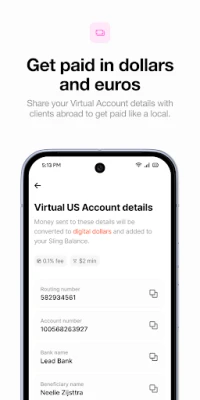Running a business or freelancing? Clients abroad can pay your Sling Money Virtual USD or EUR Account directly, without needing Sling Money themselves. They can send you a bank transfer, just like they would pay a local, and you can either hold the money in digital dollars or digital euros, or withdraw to your local currency.