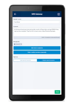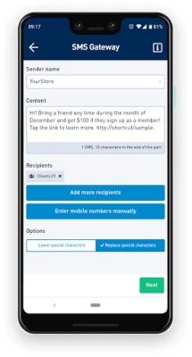 - send SMS to single contacts and groups, - access your account balance, - review the history of messages that you sent.