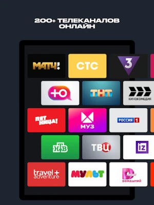 — 200+ телеканалов, включая популярные (СТС, «Пятница!», ТНТ, «Матч ТВ» и множество других), которые можно смотреть онлайн;
