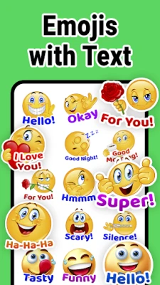 The app includes text stickers and emojis with text for different moods and occasions, such as love, greetings, good morning, good night, funny reactions, birthdays, and more. You can easily find the right sticker to say “hello,” “I miss you,” “I love you,” or just make someone smile.