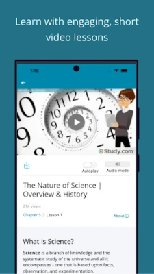The Study.com app will help you learn any academic subject on the go. Our short, fun video lessons, taught by expert teachers, provide homework help for difficult topics from your classes with easy-to-understand examples and animations. Become a member to ace your next test with Study.com’s online courses and test prep.