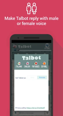 Talbot speaks ENGLISH, ITALIAN, SPANISH and PORTUGUESE: please note that all the languages are implemented via an automatic translator, so, be kind in your Play Store review 😊