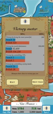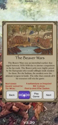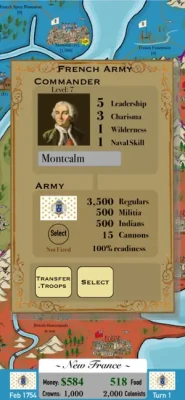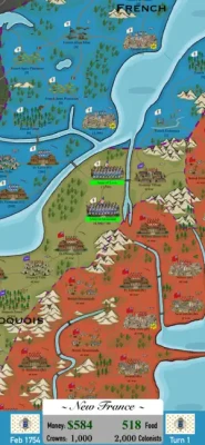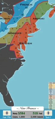 War in America (The French and Indian War) is a war game set in the 17th and 18th century's during the discovery period. It is a turn-based conquest game pitting 4 European nations and 16 Indian nations in an epic struggle for control of the east coast of North America. Use your armies to explore, conquer and settle new lands. Develop and build towns and villages, gather resources and trade with your neighbours to make treaties and alliances. You can play as either the Indian or European nations, using any one of the many great commanders to lead your army to victory or defeat.