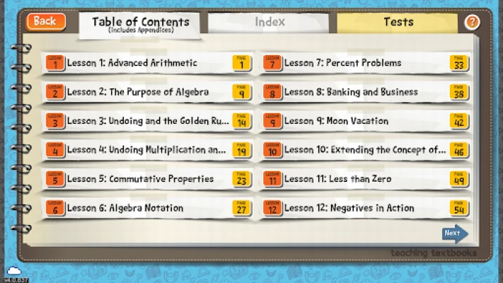 • the digitized version of the printed Teaching Textbooks Algebra 1 textbook (with a search feature and a hyper-linked index)