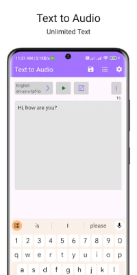 Download Text to Audio now and start converting text to audio effortlessly. With features like unlimited text support, multi-language conversion, easy text saving, WAV export, and background playback, this app is your all-in-one solution for turning text into audio. Perfect for enhancing productivity, learning new languages, and enjoying your content on the go.