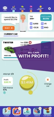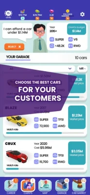 Have you ever thought what it's like to run and expand a used car business? Play as a young entrepreneur and make your own career! “Used Car Dealer” is a used car simulator game that simulates the process of purchasing and selling used cars. You will have several ways of purchasing cars, and almost 100 different car models to choose from. The clients have specific needs. One of your tasks is to find the most suitable car for them!