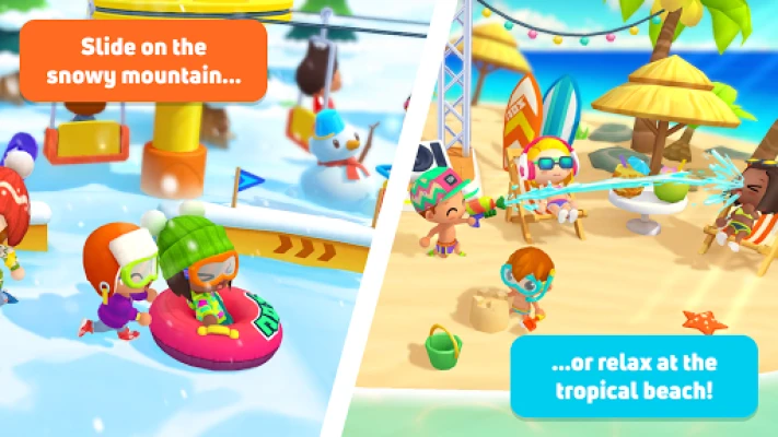 Kids can take care of this family hotel — helping guests check in, prepare their rooms, serve food at the restaurant or invite them to the pool and spa. They can also travel on exciting vacation adventures: go camping in the forest, ski at the snow resort, enjoy a beach music festival or have fun at a theme park full of attractions.