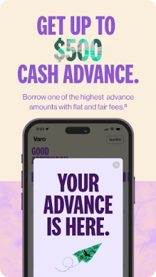⁸Advance is a small dollar line of credit. Qualifications apply, including direct deposits to your Varo Bank Account: www.varomoney.com/cash-advance. Information about advance amounts is based on November 2023 internal Varo research among single standalone loans with repayments of 30 days or less, no subscription fees or early wage payment requirements.
