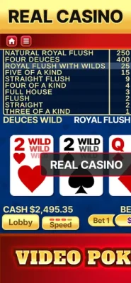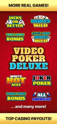 Video Poker Deluxe is a social casino game and does not contain any real money gambling. This product does not offer the opportunity to win money, gifts, or anything of monetary value. This product is intended for use by those 18 or older and is for amusement purposes only. This game includes in-app purchases. Practice or success at social casino gaming does not imply future success at real money gambling and gaming.