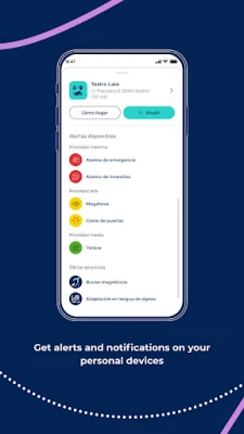 • Visualfy Places: Receive emergency and informative accessible notifications by public spaces adapted by Visualfy, just by subscribing to the building services, also free of charge. Safer and always informed in hospitals, libraries, public attention offices and other public and private buildings.