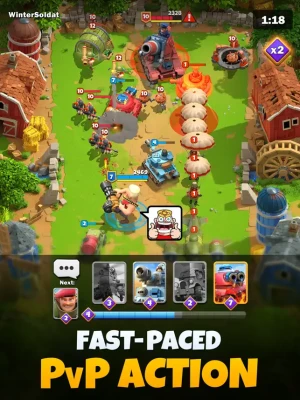 Take on other combatants in real-time battles, commanding one of the many unique Heroes, while deploying cards from your customized battle deck. Victories provide you with the spoils of war you’ll need to upgrade your troops, acquire new cards, and increase in power!