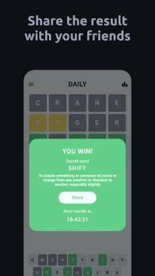 • Daily tasks • 2 different dictionaries for the game • Share the result with your friends • More than 5000 levels • Check your daily statistic • Meanings of words that you didn't know before • Changing the theme